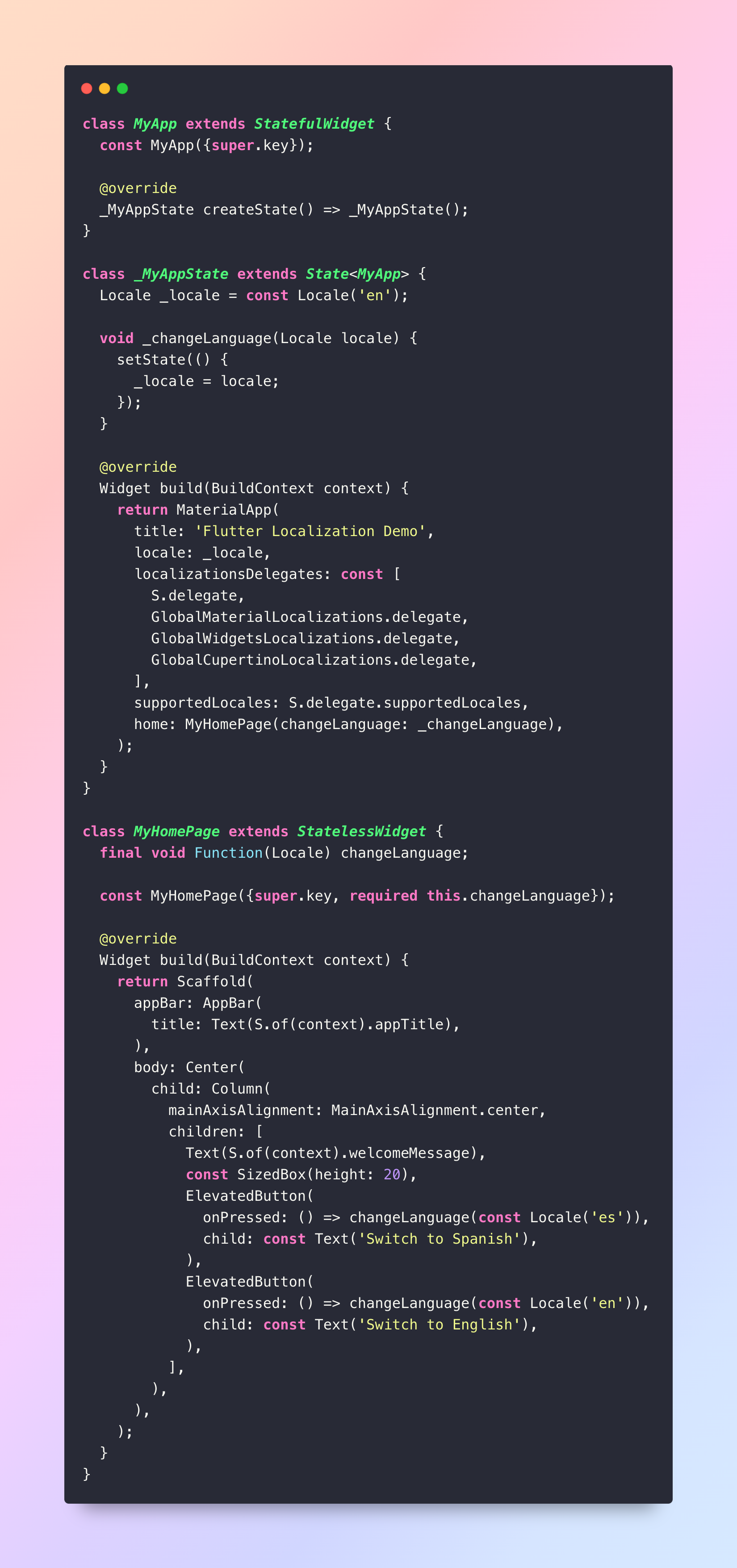 - Next, configure your MaterialApp to support localization. Open lib/main.dart and modify the code as follows: