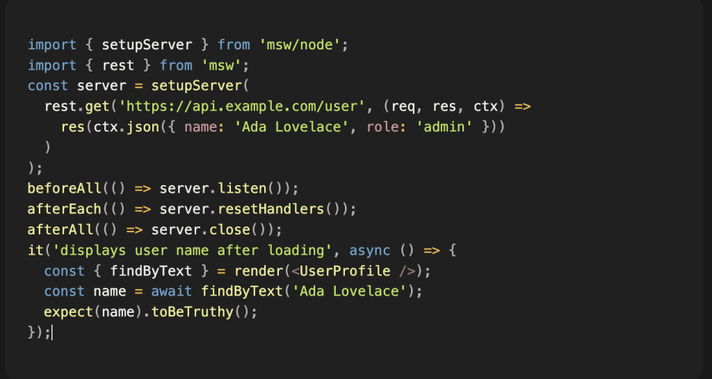 Components that fetch data need a reliable way to simulate API responses. MSW makes this elegant — you define handlers that intercept fetch calls, and your component code doesn’t change at all.