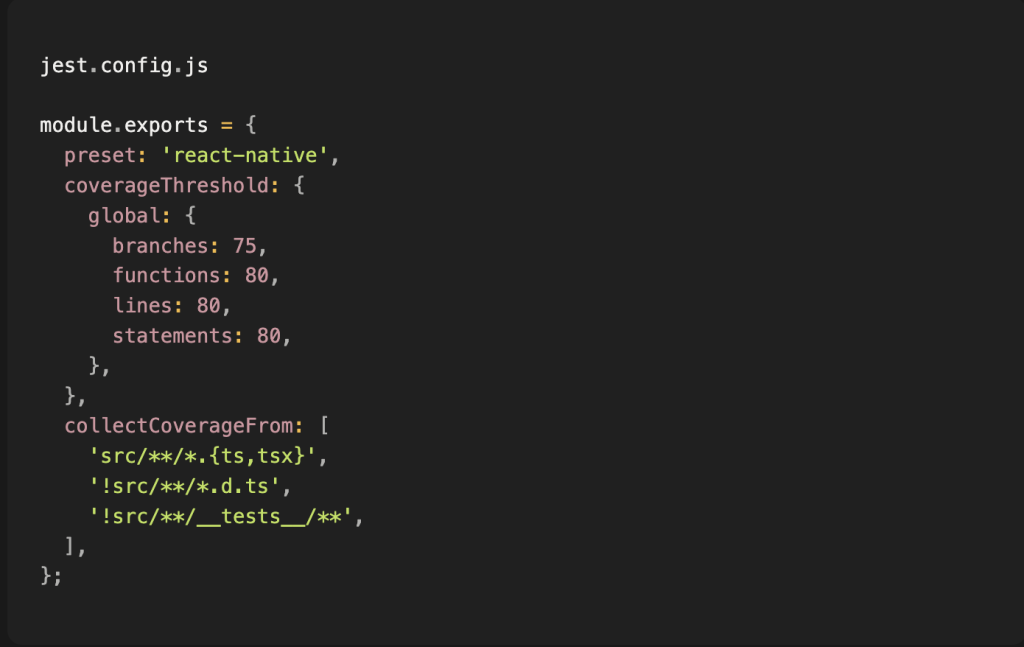 You can enforce minimum coverage levels in your Jest config, causing the test run to fail if coverage drops below your threshold — invaluable in CI pipelines.