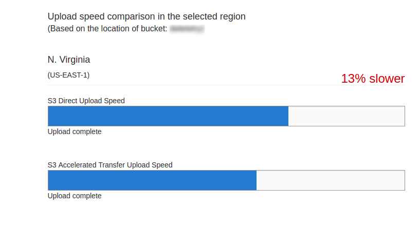 The Transfer Acceleration is to be enabled before being used like Versioning feature of AWS S3. You have to suspend the feature if you don’t want to use it. But before using it, you want to make sure that is there any advantage of using this feature or not ? To test it, Amazon has given a tool which will upload a file to your S3 bucket via both methods: Direct upload and transferred acceleration upload: