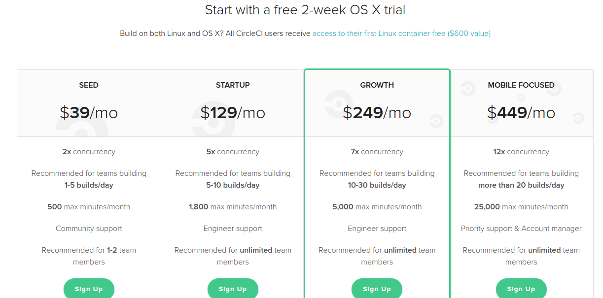 CircleCI has three different pricing plans for Linux , OS X and Enterprise respectively.