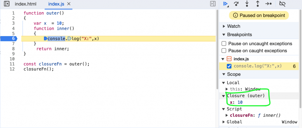 In this inner function is returned, as we can see that the outer function is executed, but if we go to execute the closureFn function, which actually contains the inner function will print X: 10, because it remembers its lexical scope, even after execution of its parent function.