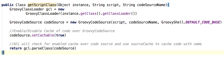 Interestingly GroovyClassLoader provide loading of groovy script and parsing of class and GroovyCodeSource provide caching of source so that we don’t need to recompile it every time until and unless there are any changes over script from last compilation.