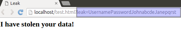 In reality, the attacker would be displaying, say a ‘404 Not Found’ message on the web page. The highlighted URL shows the contents of other users being exfiltrated. (I have used localhost to demonstrate this. In reality, an attacker would be using one of his domains).
