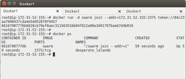 Now, Docker Swarm cluster is ready. New containers can be launched in the cluster from any of the nodes. Simply execute “docker run” command to launch containers. Let’s roll a few containers and check if they can be launched on any of the servers in Swarm cluster: