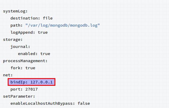- In the mongo.conf file, look for the bindIp address as 0.0.0.0 or any value that might be making it accessible from insecure and not required origins.