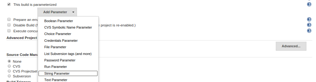 Step 2: Choose “This build is parameterized” and then the type of parameter which you want from the options in the drop down menu. We have chosen “String parameter” option for simplicity.