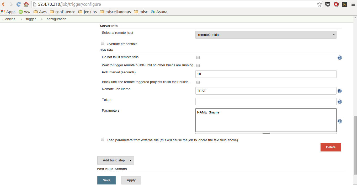 Type the name of the job which you want to build on remote jenkins server i.e. “TEST” job on JenkinsTwo server in our case. Specify the parameter i.e “NAME” required by the “TEST” job. Also, we need to use the value defined here in “name” parameter as shown below. Save your configuration changes.