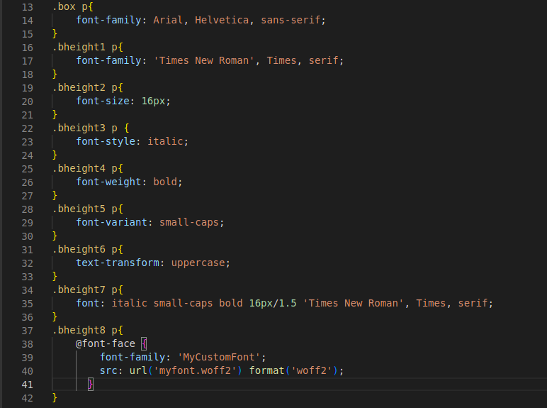 ● Generic Font Families: We can also use generic font families as fallbacks. Common generic font families include serif, sans-serif, monospace, cursive, and fantasy.